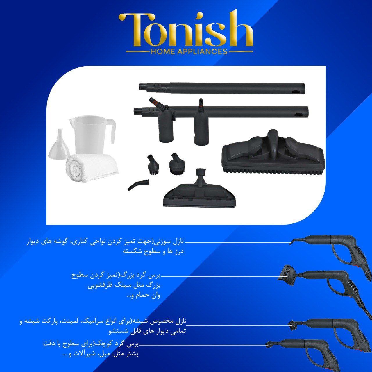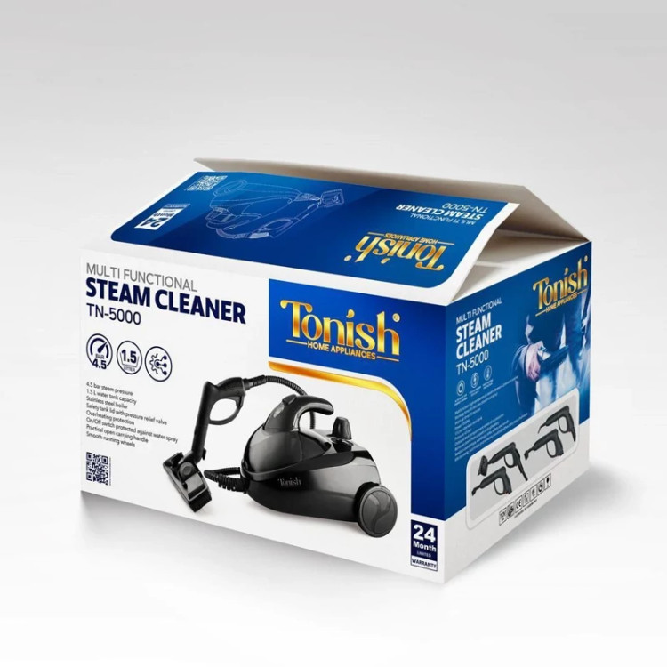 مدل TN-5000 بخار شوی تونیش، ترکیبی از قدرت و ایمنی است. با توان ۱۵۰۰ وات و بخار ۴.۵ بار، هر نوع آلودگی را پاک میکند. مخزن ۱.۵ لیتری آن، ۴۵ دقیقه بخاردهی پیوسته دارد. دیگ فولادی ضدزنگ، عمر طولانی را تضمین میکند و نازلهای مختلف، سطوح بزرگ و کوچک را بهخوبی پوشش میدهند. سیستم قطع حرارتی و چرخهای روان، استفاده از دستگاه را آسان و ایمن میسازند.