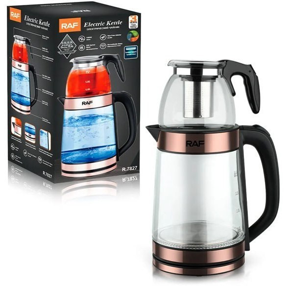 چایساز راف مدل R‑7898 یک چایساز شیشهای دوطبقه با طراحی ساده و کاربردی است که برای استفاده روزانه در خانه و محیطهای اداری گزینهای مناسب محسوب میشود. این مدل دارای یک کتری شیشهای با ظرفیت ۲ لیتر و یک قوری شیشهای ۰.۸ لیتری مجهز به صافی استیل است که امکان دمکردن چای خوشعطر و بدون تفاله را فراهم میکند.