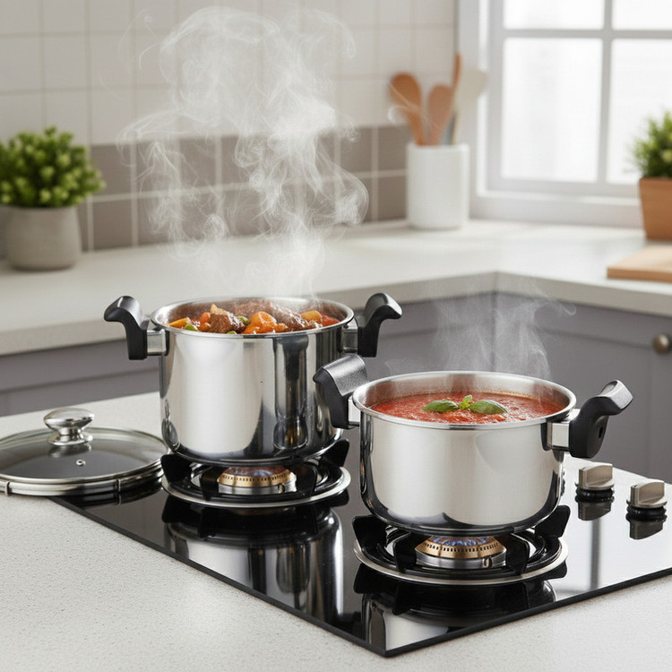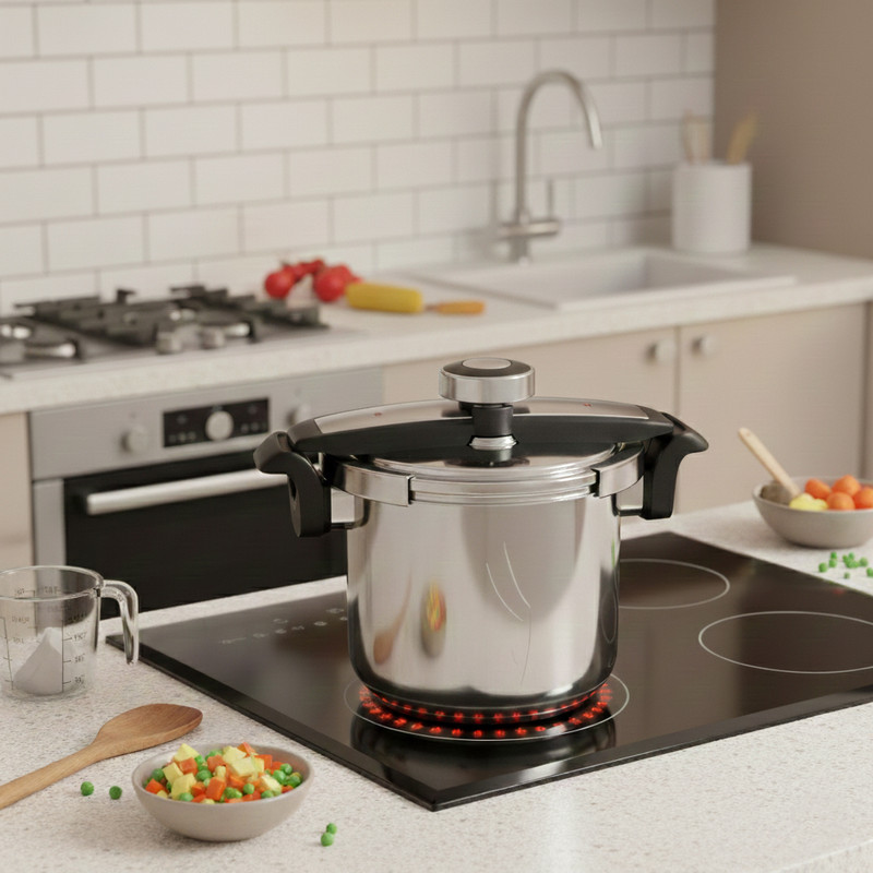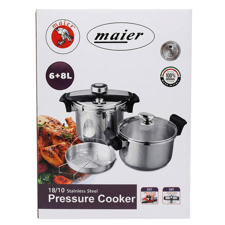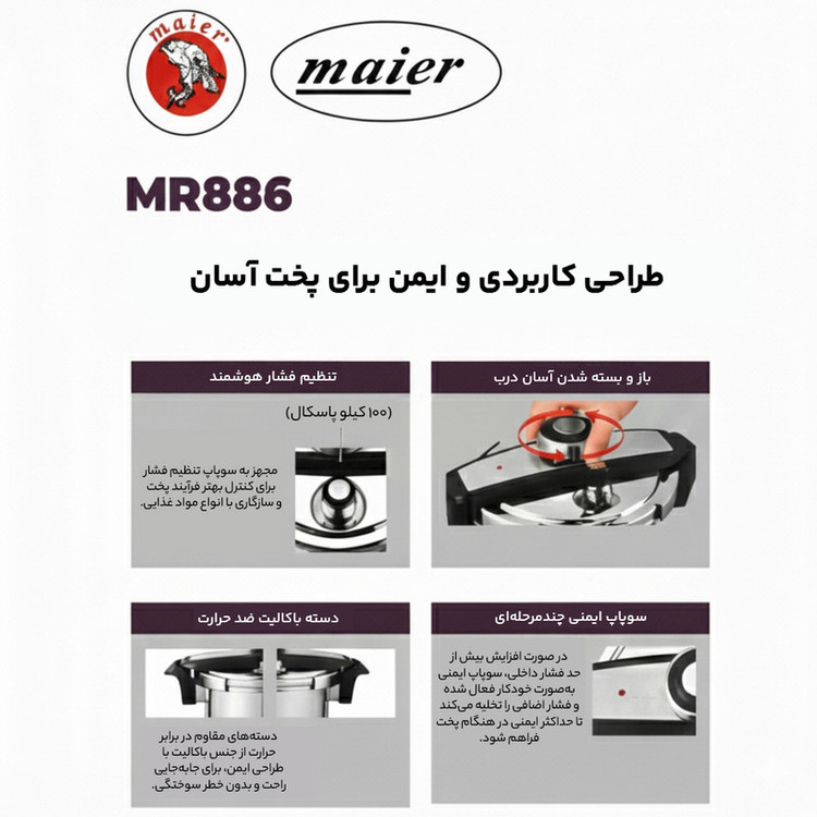 مجهز به سیستم ایمنی چندمرحلهای-دستههای باکالیت ضد حرارت-دارای سوپاپ تنظیم فشار قابل انتخاب متناسب با نوع مواد غذایی و روش پخت-دارای محافظ شعله استیل